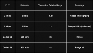 • Coded PHY (S=2): 500 Kbps (the speed is lower but the scale is farther).