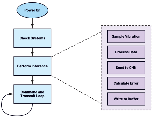 When an inference is requested, the AI microcontroller wakes and requests data from the accelerometer. Importantly, it then performs the same preprocessing steps to the time series data as used in the training. Finally, the output of this preprocessing is fed to the deployed neural network, which can report a classification.