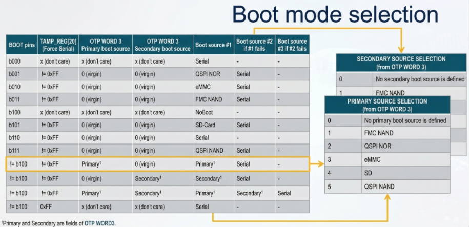 - The one time programmable WORD 3 contains a primary boot source and a secondary boot source, shown in the third and fourth columns, respectively. The possible values for the boot sources are listed in the tables on the right: parallel NAND Flash, QUADSPI NOR Flash, eMMC, SD Card or QUADSPI NAND flash.