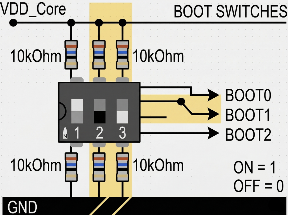 - Static Voltage Check: Use a multimeter to measure the voltage directly at the test points of the BOOT0, BOOT1, and BOOT2 pins while the board is powered on. High level ≥ 0.7 VDD vs Low level ≤ 0.3 VDD.