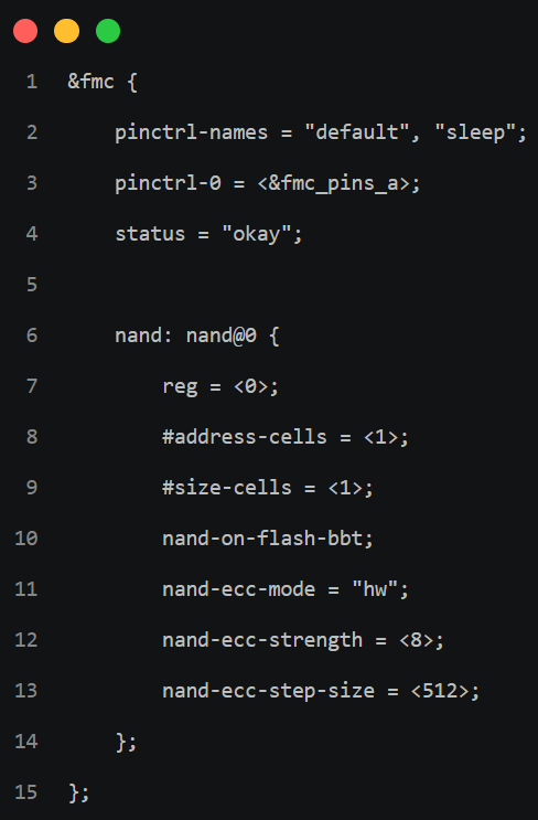 - nand-ecc-mode: For STM32MP1, this value is usually “hw” (using hardware FMC acceleration). If your NAND chip has built-in error correction, use “on-die”.