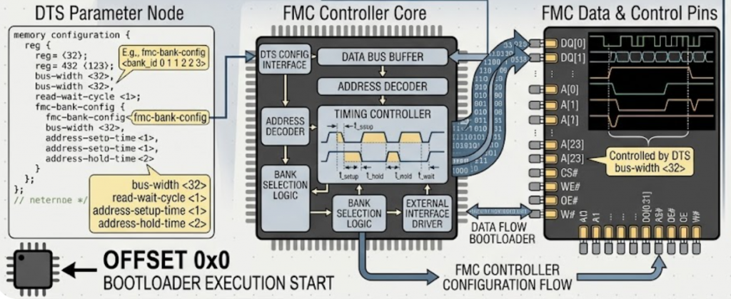 To fix the “Silent Boot” error (no console response), we need to delve into the boot chain mechanism of the STM32MP1 system. This process is not simply about reading data; it’s a coordinated sequence between hardware (FMC) and a tightly structured data set defined by the ROM code.
